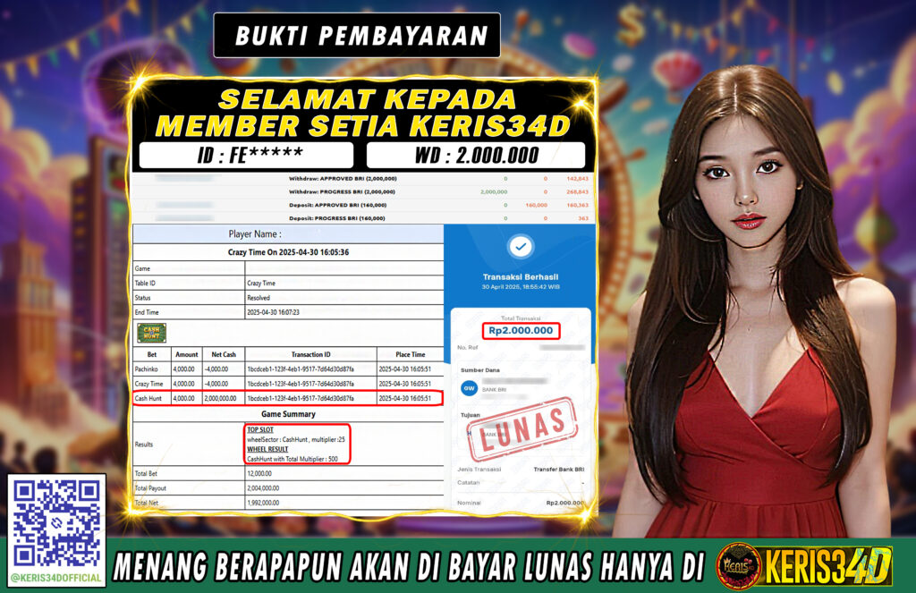 Setiap hari, member KERIS34D berhasil meraih jackpot besar dari berbagai provider slot ternama yang kami sediakan, seperti Pragmatic Play, Habanero, PG Soft, dan masih banyak lagi. Kami secara rutin menampilkan bukti screenshot atau rekapan kemenangan yang berhasil diraih, mulai dari kemenangan ratusan ribu hingga puluhan juta rupiah. Semua slip kemenangan ini kami hadirkan untuk membuktikan bahwa di KERIS34D, peluang menang itu nyata