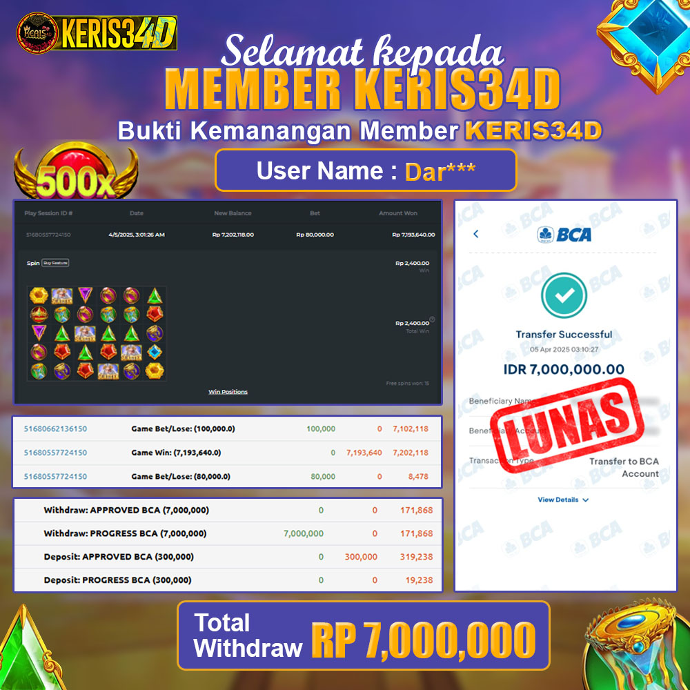 Setiap hari, member KERIS34D berhasil meraih jackpot besar dari berbagai provider slot ternama yang kami sediakan, seperti Pragmatic Play, Habanero, PG Soft, dan masih banyak lagi. Kami secara rutin menampilkan bukti screenshot atau rekapan kemenangan ya
