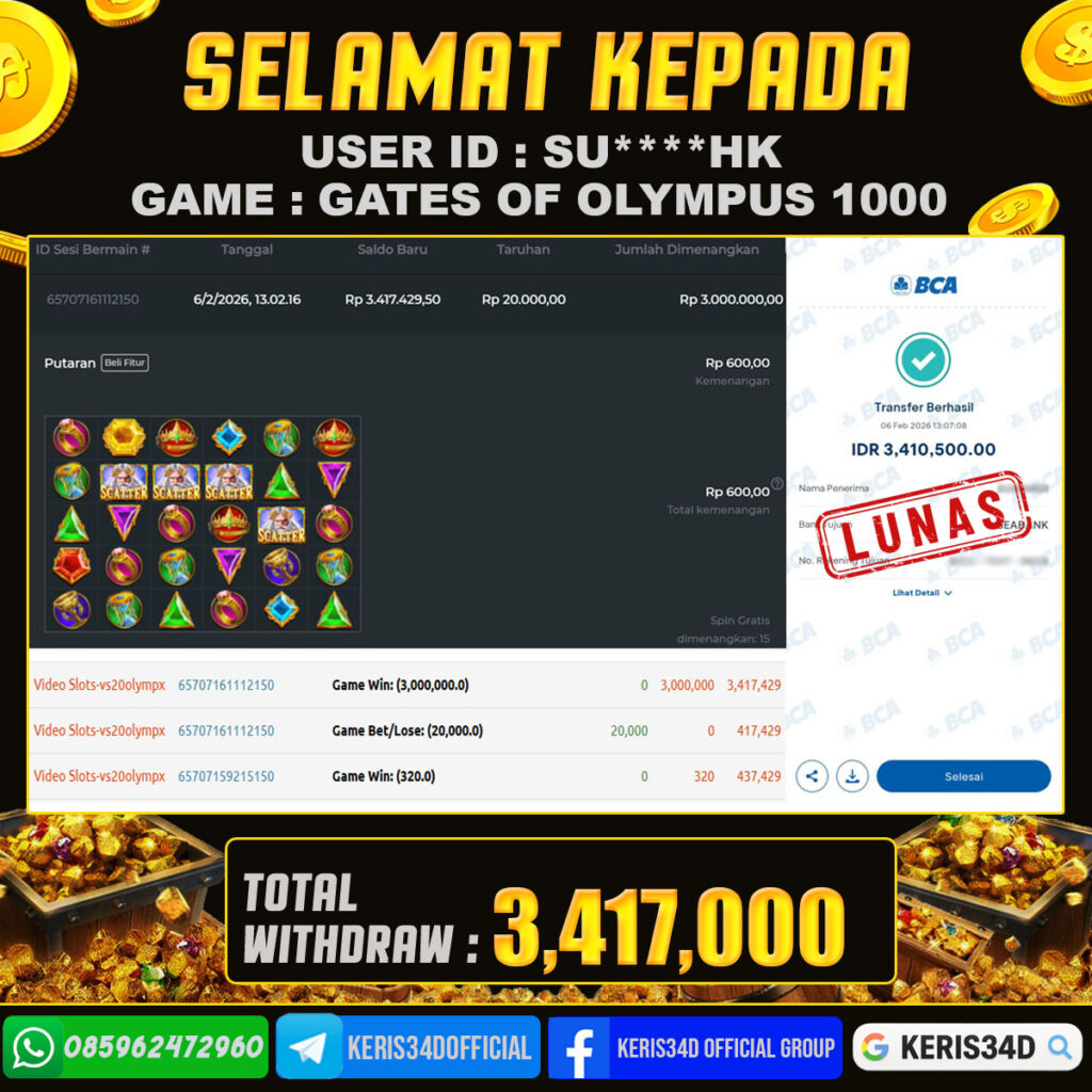 Setiap hari, member KERIS34D berhasil meraih jackpot besar dari berbagai provider slot ternama yang kami sediakan, seperti Pragmatic Play, Habanero, PG Soft, dan masih banyak lagi. Kami secara rutin menampilkan bukti screenshot atau rekapan kemenangan yang berhasil diraih, mulai dari kemenangan ratusan ribu hingga puluhan juta rupiah. Semua slip kemenangan ini kami hadirkan untuk membuktikan bahwa di KERIS34D, peluang menang itu nyata