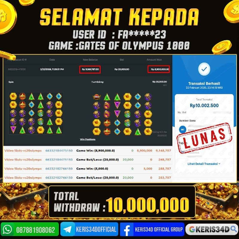 KERIS34D dikenal sebagai situs terpercaya yang selalu menghadirkan pengalaman bermain slot online yang aman, fair, dan berlisensi resmi. Di sini, kami tidak hanya sekadar memberikan janji, tapi bukti nyata berupa slip kemenangan yang dapat Anda lihat secara langsung.