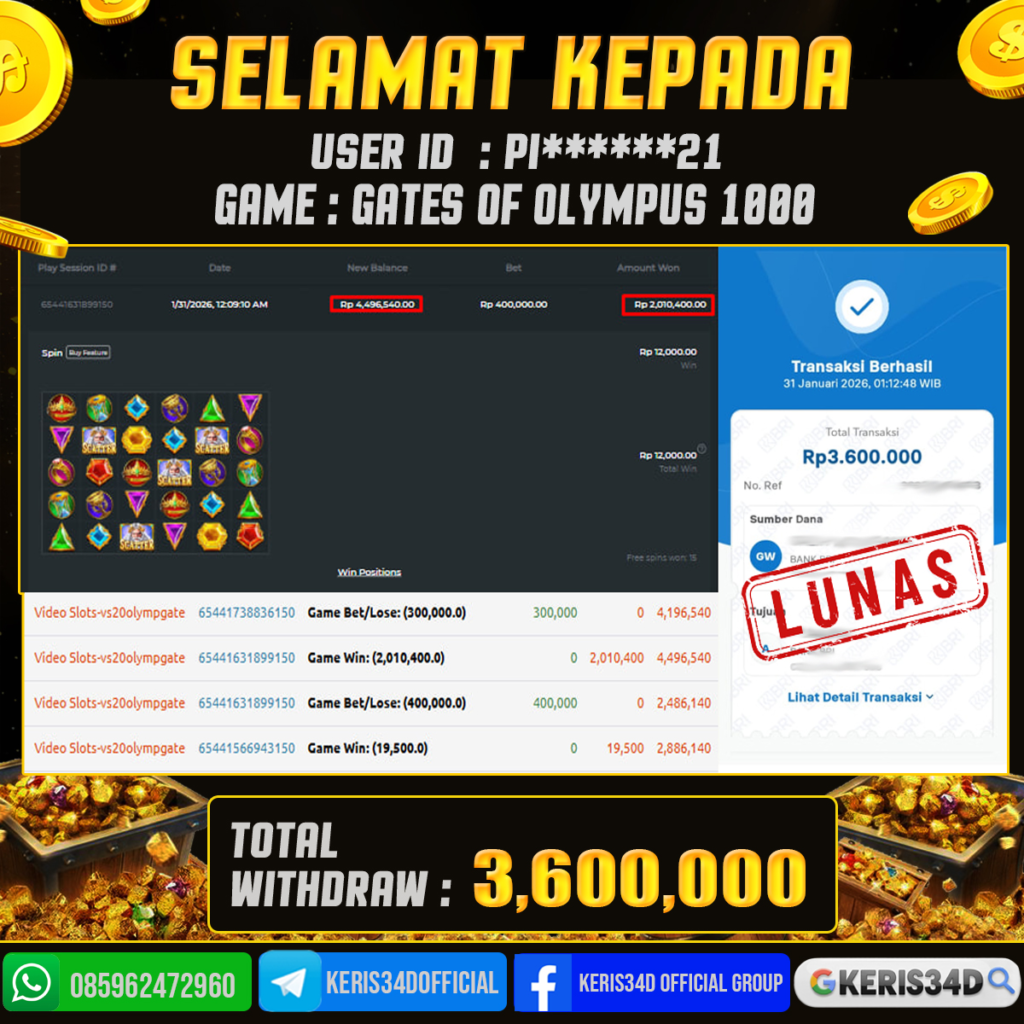 JACKPOT SLOT GACOR GATES OF OLYMPUS 1000 31 JANUARI 2026, Jackpot Slot Gacor, Kemenangan Slot, Bukti Kemenangan Slot, Kemenangan PRAGMATIC PLAY, Menang Slot online, Slot Gacor, Situs Aman Terpercaya, WD Berapapun Pasti DI Bayar Tuntas, Maxwin Slot Online.