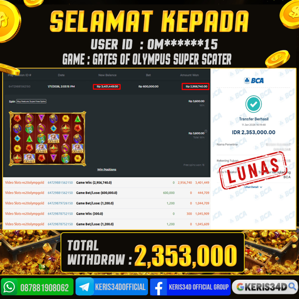 KERIS34D dikenal sebagai situs terpercaya yang selalu menghadirkan pengalaman bermain slot online yang aman, fair, dan berlisensi resmi. Di sini, kami tidak hanya sekadar memberikan janji, tapi bukti nyata berupa slip kemenangan yang dapat Anda lihat secara langsung.