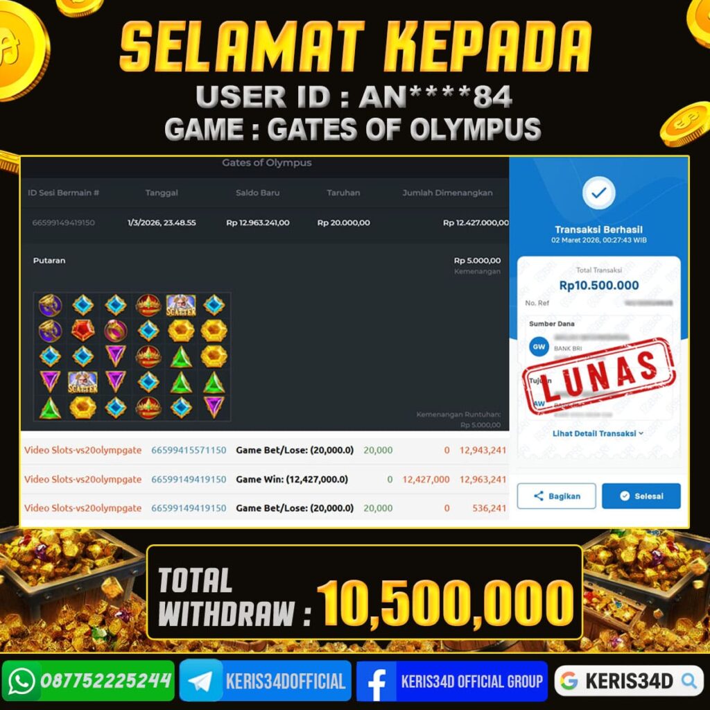KERIS34D dikenal sebagai situs terpercaya yang selalu menghadirkan pengalaman bermain slot online yang aman, fair, dan berlisensi resmi. Di sini, kami tidak hanya sekadar memberikan janji, tapi bukti nyata berupa slip kemenangan yang dapat Anda lihat secara langsung.