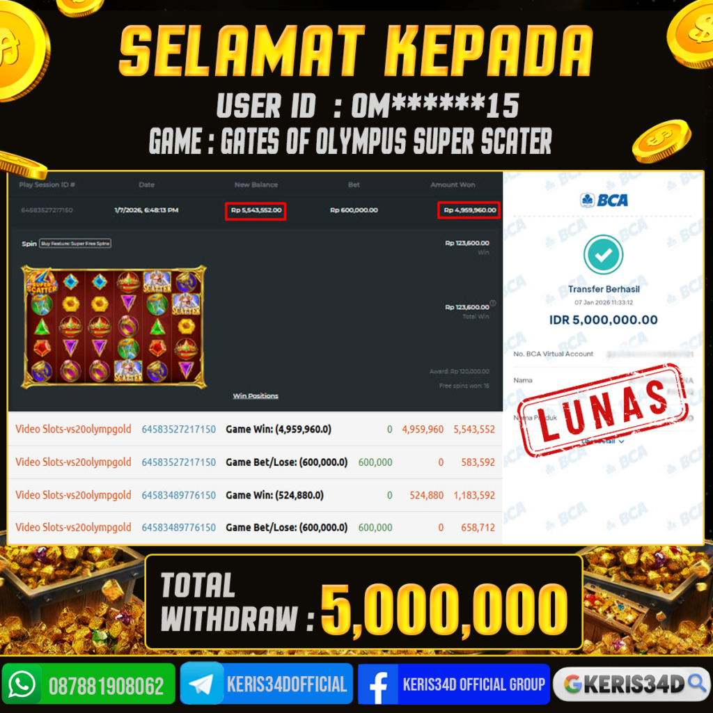 Setiap hari, member KERIS34D berhasil meraih jackpot besar dari berbagai provider slot ternama yang kami sediakan, seperti Pragmatic Play, Habanero, PG Soft, dan masih banyak lagi. Kami secara rutin menampilkan bukti screenshot atau rekapan kemenangan yang berhasil diraih, mulai dari kemenangan ratusan ribu hingga puluhan juta rupiah. Semua slip kemenangan ini kami hadirkan untuk membuktikan bahwa di KERIS34D, peluang menang itu nyata