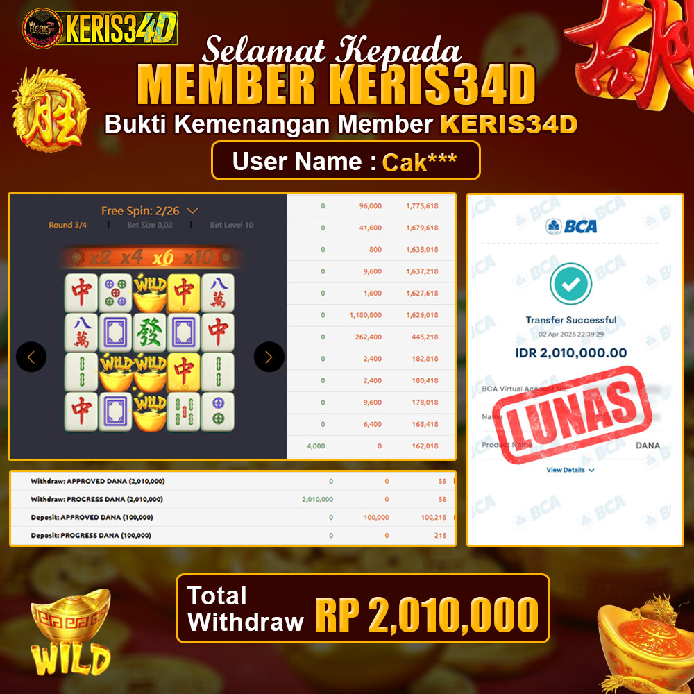 Setiap hari, member KERIS34D berhasil meraih jackpot besar dari berbagai provider slot ternama yang kami sediakan, seperti Pragmatic Play, Habanero, PG Soft, dan masih banyak lagi. Kami secara rutin menampilkan bukti screenshot atau rekapan kemenangan yang berhasil diraih, mulai dari kemenangan ratusan ribu hingga puluhan juta rupiah. Semua slip kemenangan ini kami hadirkan untuk membuktikan bahwa di KERIS34D, peluang menang itu nyata
