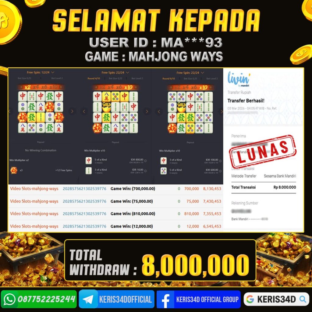 Setiap hari, member KERIS34D berhasil meraih jackpot besar dari berbagai provider slot ternama yang kami sediakan, seperti Pragmatic Play, Habanero, PG Soft, dan masih banyak lagi. Kami secara rutin menampilkan bukti screenshot atau rekapan kemenangan yang berhasil diraih, mulai dari kemenangan ratusan ribu hingga puluhan juta rupiah. Semua slip kemenangan ini kami hadirkan untuk membuktikan bahwa di KERIS34D, peluang menang itu nyata
