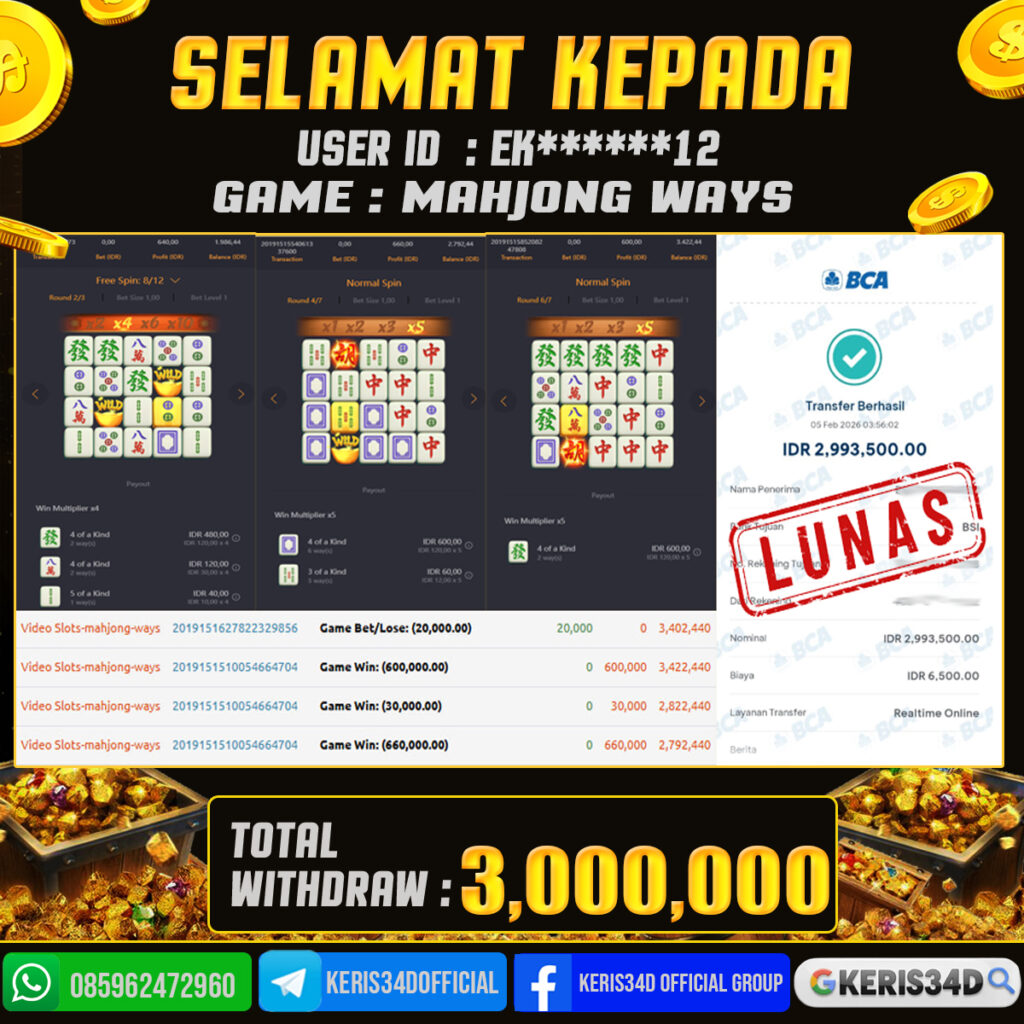 Setiap hari, member KERIS34D berhasil meraih jackpot besar dari berbagai provider slot ternama yang kami sediakan, seperti Pragmatic Play, Habanero, PG Soft, dan masih banyak lagi. Kami secara rutin menampilkan bukti screenshot atau rekapan kemenangan yang berhasil diraih, mulai dari kemenangan ratusan ribu hingga puluhan juta rupiah. Semua slip kemenangan ini kami hadirkan untuk membuktikan bahwa di KERIS34D, peluang menang itu nyata
