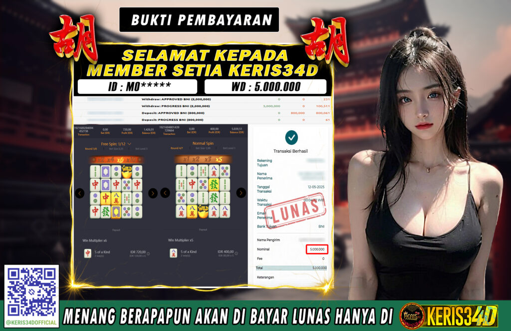 Setiap hari, member KERIS34D berhasil meraih jackpot besar dari berbagai provider slot ternama yang kami sediakan, seperti Pragmatic Play, Habanero, PG Soft, dan masih banyak lagi. Kami secara rutin menampilkan bukti screenshot atau rekapan kemenangan yang berhasil diraih, mulai dari kemenangan ratusan ribu hingga puluhan juta rupiah. Semua slip kemenangan ini kami hadirkan untuk membuktikan bahwa di KERIS34D, peluang menang itu nyata