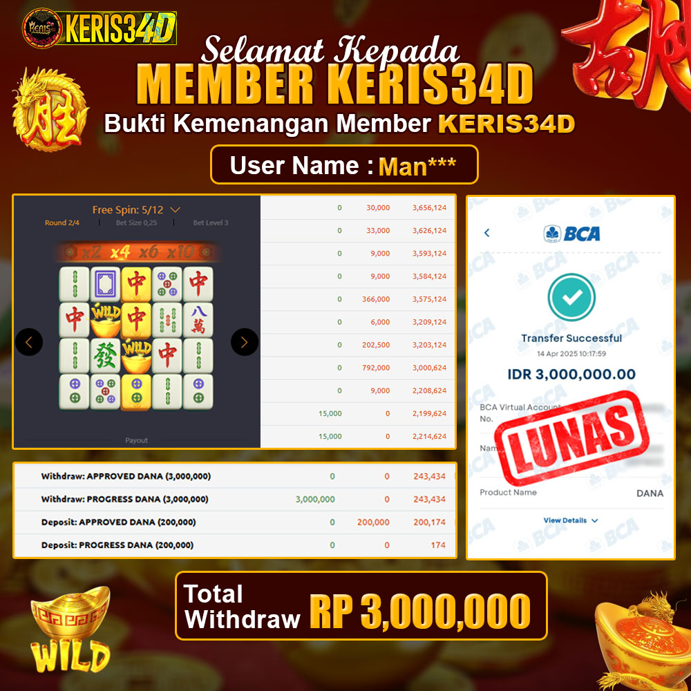 Setiap hari, member KERIS34D berhasil meraih jackpot besar dari berbagai provider slot ternama yang kami sediakan, seperti Pragmatic Play, Habanero, PG Soft, dan masih banyak lagi. Kami secara rutin menampilkan bukti screenshot atau rekapan kemenangan yang berhasil diraih, mulai dari kemenangan ratusan ribu hingga puluhan juta rupiah. Semua slip kemenangan ini kami hadirkan untuk membuktikan bahwa di KERIS34D, peluang menang itu nyata