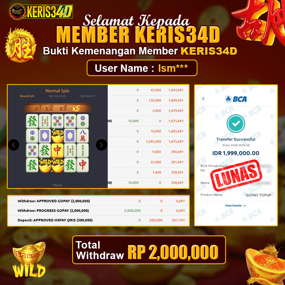 Setiap hari, member KERIS34D berhasil meraih jackpot besar dari berbagai provider slot ternama yang kami sediakan, seperti Pragmatic Play, Habanero, PG Soft, dan masih banyak lagi. Kami secara rutin menampilkan bukti screenshot atau rekapan kemenangan yang berhasil diraih, mulai dari kemenangan ratusan ribu hingga puluhan juta rupiah. Semua slip kemenangan ini kami hadirkan untuk membuktikan bahwa di KERIS34D, peluang menang itu nyata