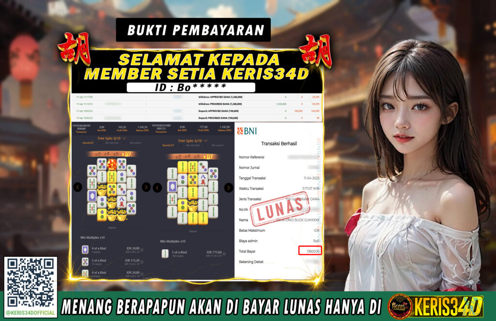 Setiap hari, member KERIS34D berhasil meraih jackpot besar dari berbagai provider slot ternama yang kami sediakan, seperti Pragmatic Play, Habanero, PG Soft, dan masih banyak lagi. Kami secara rutin menampilkan bukti screenshot atau rekapan kemenangan yang berhasil diraih, mulai dari kemenangan ratusan ribu hingga puluhan juta rupiah. Semua slip kemenangan ini kami hadirkan untuk membuktikan bahwa di KERIS34D, peluang menang itu nyata