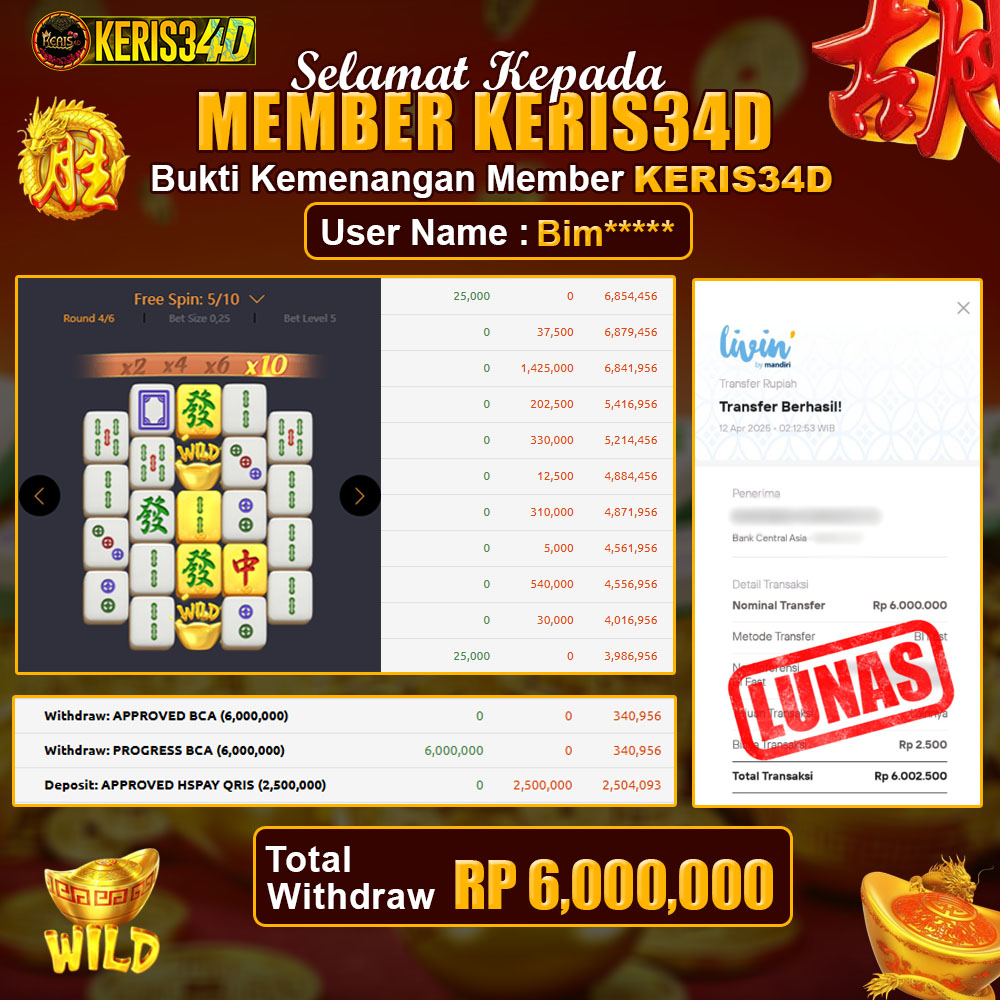 Setiap hari, member KERIS34D berhasil meraih jackpot besar dari berbagai provider slot ternama yang kami sediakan, seperti Pragmatic Play, Habanero, PG Soft, dan masih banyak lagi. Kami secara rutin menampilkan bukti screenshot atau rekapan kemenangan yang berhasil diraih, mulai dari kemenangan ratusan ribu hingga puluhan juta rupiah. Semua slip kemenangan ini kami hadirkan untuk membuktikan bahwa di KERIS34D, peluang menang itu nyata