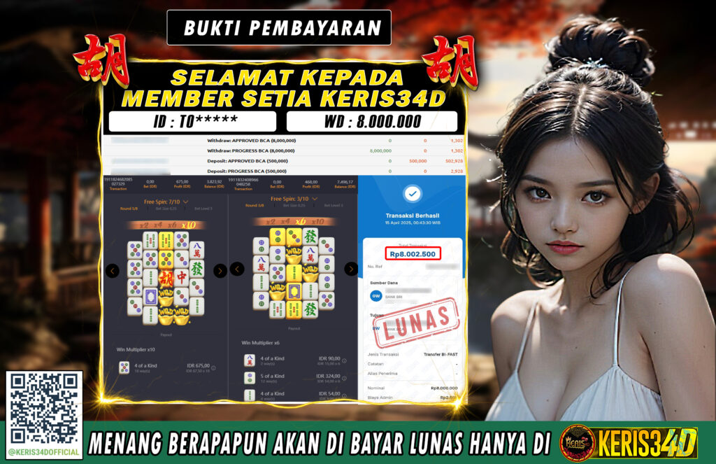 Setiap hari, member KERIS34D berhasil meraih jackpot besar dari berbagai provider slot ternama yang kami sediakan, seperti Pragmatic Play, Habanero, PG Soft, dan masih banyak lagi. Kami secara rutin menampilkan bukti screenshot atau rekapan kemenangan yang berhasil diraih, mulai dari kemenangan ratusan ribu hingga puluhan juta rupiah. Semua slip kemenangan ini kami hadirkan untuk membuktikan bahwa di KERIS34D, peluang menang itu nyata