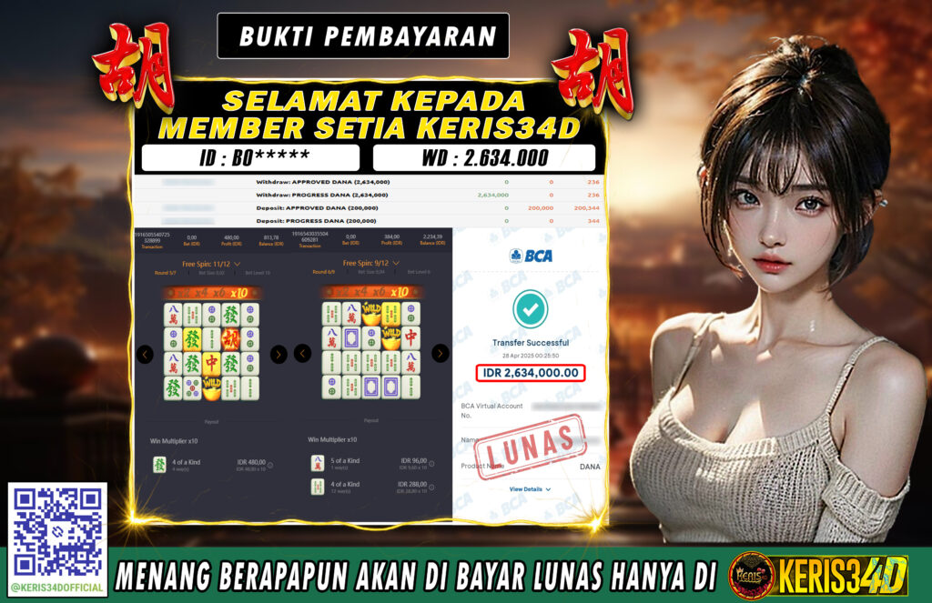 Setiap hari, member KERIS34D berhasil meraih jackpot besar dari berbagai provider slot ternama yang kami sediakan, seperti Pragmatic Play, Habanero, PG Soft, dan masih banyak lagi. Kami secara rutin menampilkan bukti screenshot atau rekapan kemenangan yang berhasil diraih, mulai dari kemenangan ratusan ribu hingga puluhan juta rupiah. Semua slip kemenangan ini kami hadirkan untuk membuktikan bahwa di KERIS34D, peluang menang itu nyata