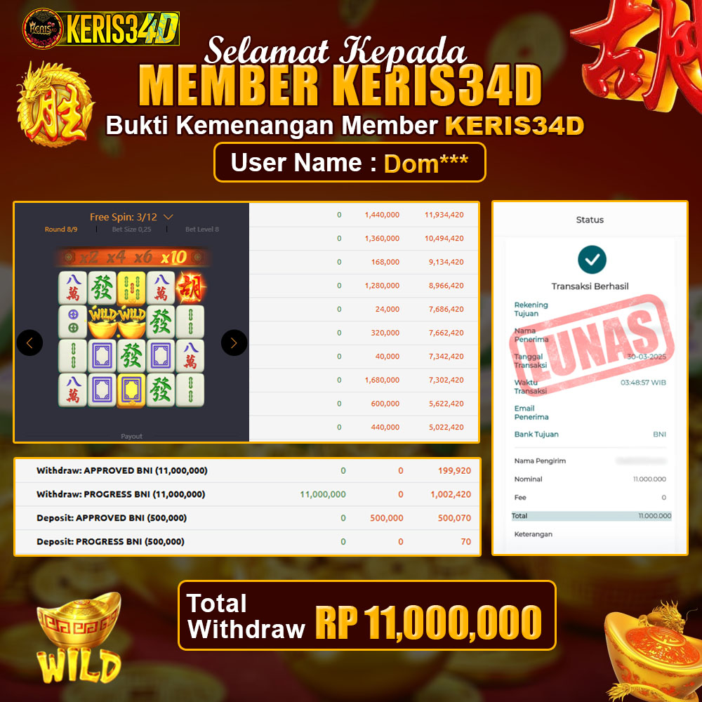 Setiap hari, member KERIS34D berhasil meraih jackpot besar dari berbagai provider slot ternama yang kami sediakan, seperti Pragmatic Play, Habanero, PG Soft, dan masih banyak lagi. Kami secara rutin menampilkan bukti screenshot atau rekapan kemenangan yang berhasil diraih, mulai dari kemenangan ratusan ribu hingga puluhan juta rupiah. Semua slip kemenangan ini kami hadirkan untuk membuktikan bahwa di KERIS34D, peluang menang itu nyata.
