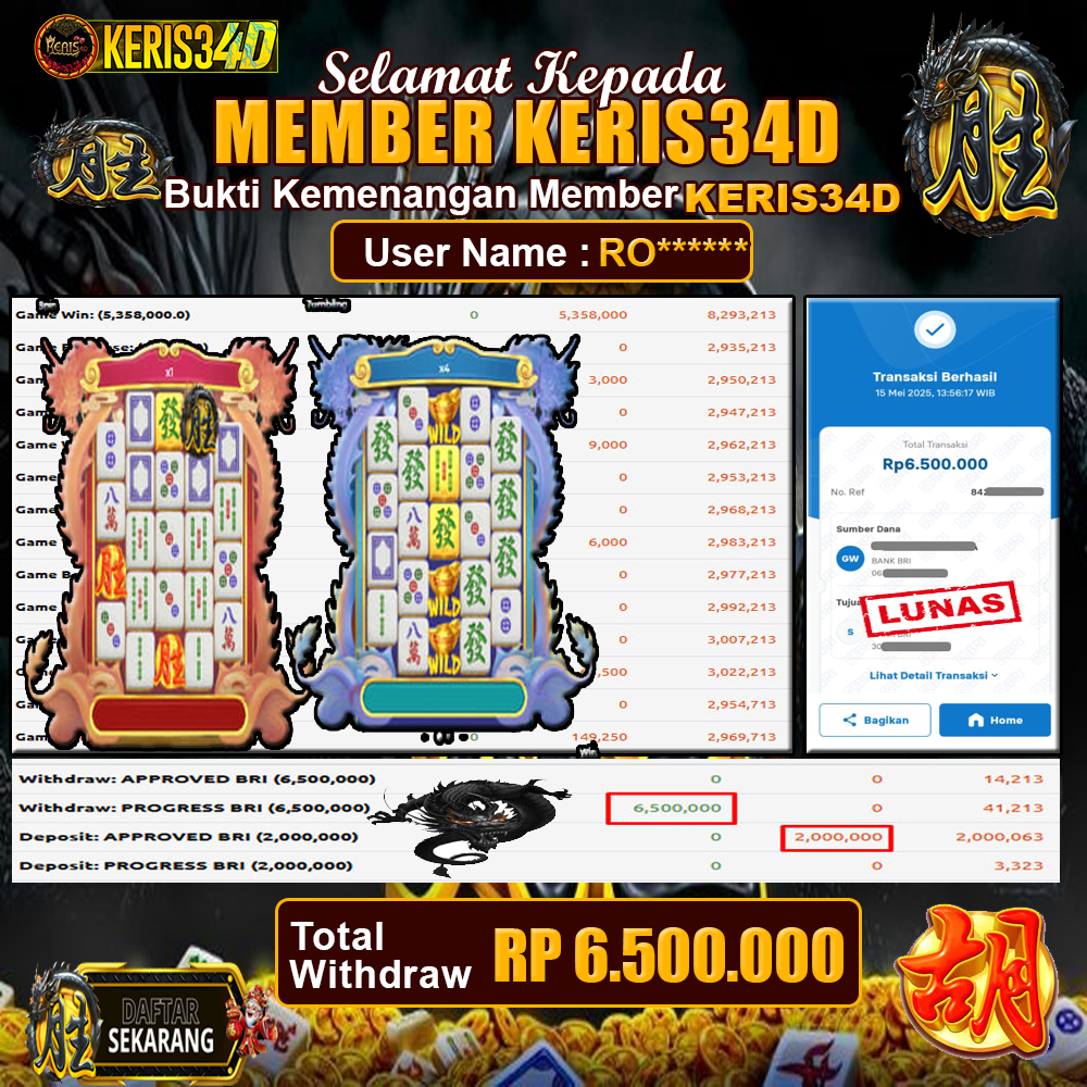 Setiap hari, member KERIS34D berhasil meraih jackpot besar dari berbagai provider slot ternama yang kami sediakan, seperti Pragmatic Play, Habanero, PG Soft, dan masih banyak lagi. Kami secara rutin menampilkan bukti screenshot atau rekapan kemenangan yang berhasil diraih, mulai dari kemenangan ratusan ribu hingga puluhan juta rupiah. Semua slip kemenangan ini kami ha