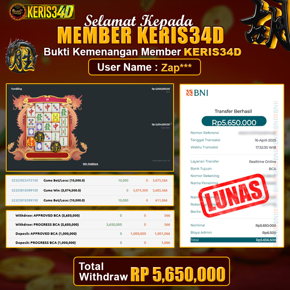 Setiap hari, member KERIS34D berhasil meraih jackpot besar dari berbagai provider slot ternama yang kami sediakan, seperti Pragmatic Play, Habanero, PG Soft, dan masih banyak lagi. Kami secara rutin menampilkan bukti screenshot atau rekapan kemenangan yang berhasil diraih, mulai dari kemenangan ratusan ribu hingga puluhan juta rupiah. Semua slip kemenangan ini kami hadirkan untuk membuktikan bahwa di KERIS34D, peluang menang itu nyata