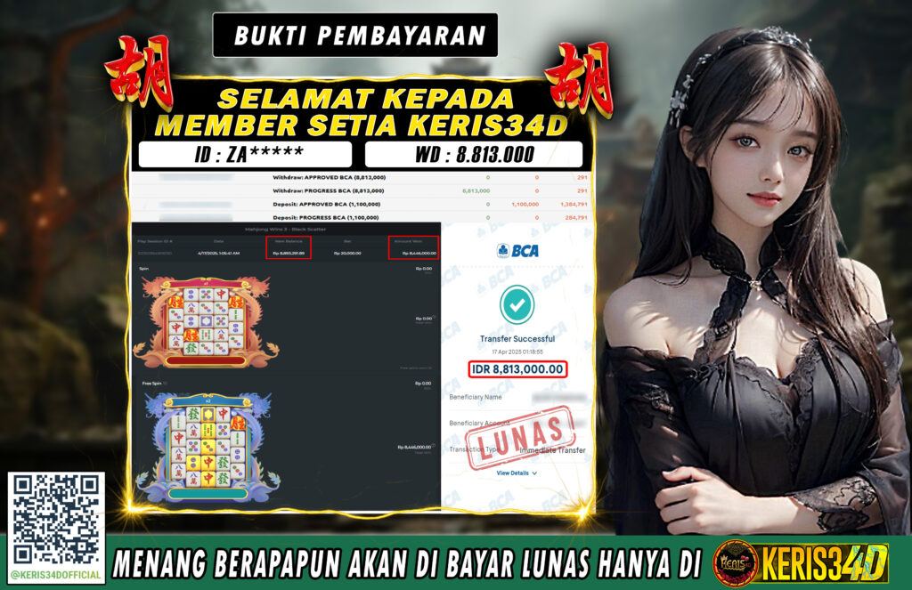 Setiap hari, member KERIS34D berhasil meraih jackpot besar dari berbagai provider slot ternama yang kami sediakan, seperti Pragmatic Play, Habanero, PG Soft, dan masih banyak lagi. Kami secara rutin menampilkan bukti screenshot atau rekapan kemenangan yang berhasil diraih, mulai dari kemenangan ratusan ribu hingga puluhan juta rupiah. Semua slip kemenangan ini kami hadirkan untuk membuktikan bahwa di KERIS34D, peluang menang itu nyata