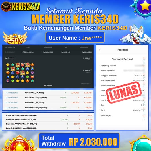 KERIS34D dikenal sebagai situs terpercaya yang selalu menghadirkan pengalaman bermain slot online yang aman, fair, dan berlisensi resmi. Di sini, kami tidak hanya sekadar memberikan janji, tapi bukti nyata berupa slip kemenangan yang dapat Anda lihat secara langsung.