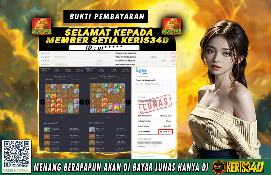 Setiap hari, member KERIS34D berhasil meraih jackpot besar dari berbagai provider slot ternama yang kami sediakan, seperti Pragmatic Play, Habanero, PG Soft, dan masih banyak lagi. Kami secara rutin menampilkan bukti screenshot atau rekapan kemenangan yang berhasil diraih, mulai dari kemenangan ratusan ribu hingga puluhan juta rupiah. Semua slip kemenangan ini kami hadirkan untuk membuktikan bahwa di KERIS34D, peluang menang itu nyata