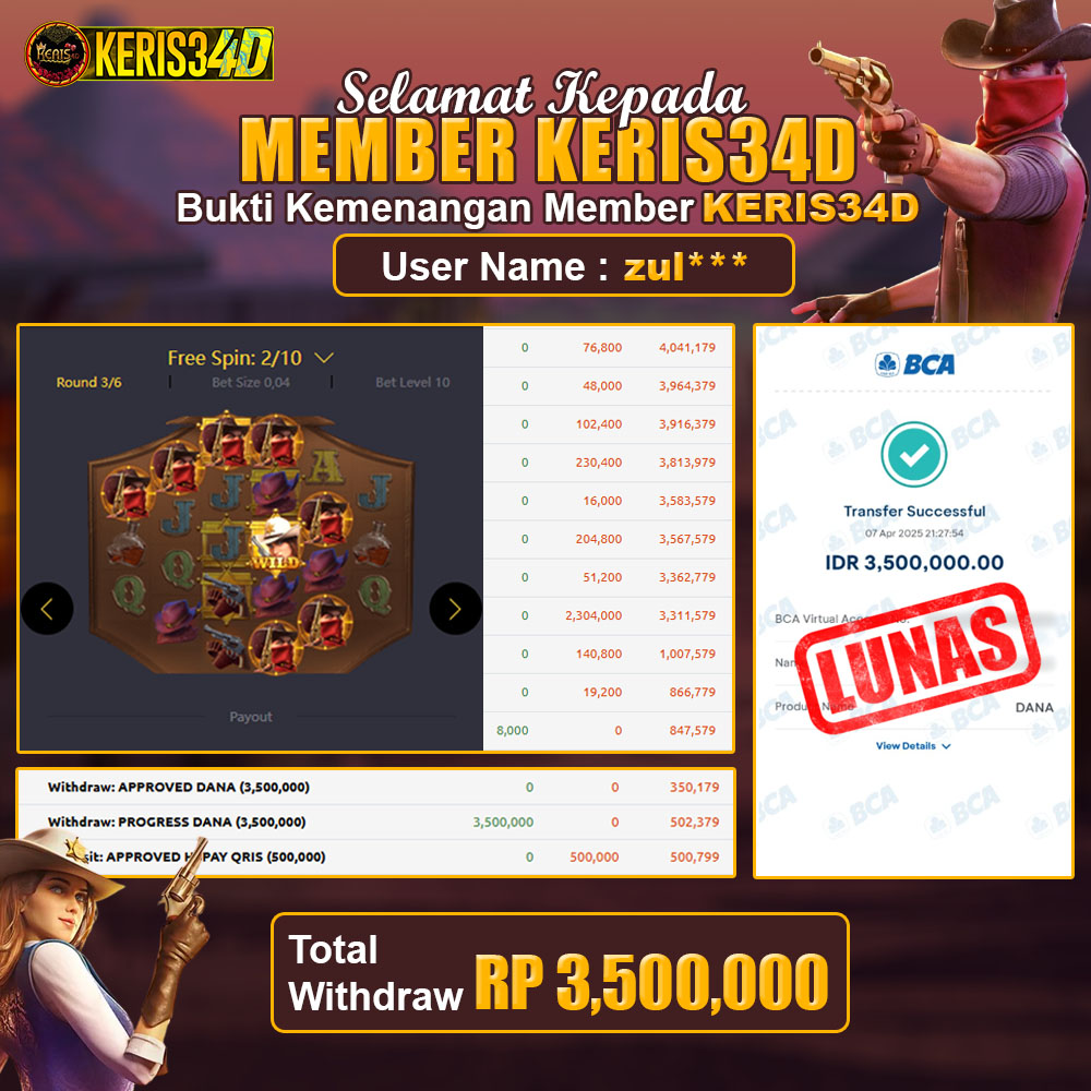 Setiap hari, member KERIS34D berhasil meraih jackpot besar dari berbagai provider slot ternama yang kami sediakan, seperti Pragmatic Play, Habanero, PG Soft, dan masih banyak lagi. Kami secara rutin menampilkan bukti screenshot atau rekapan kemenangan yang berhasil diraih, mulai dari kemenangan ratusan ribu hingga puluhan juta rupiah. Semua slip kemenangan ini kami hadirkan untuk membuktikan bahwa di KERIS34D, peluang menang itu nyata