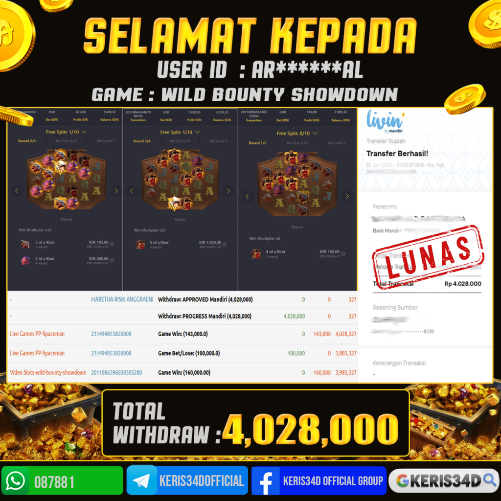 KERIS34D dikenal sebagai situs terpercaya yang selalu menghadirkan pengalaman bermain slot online yang aman, fair, dan berlisensi resmi. Di sini, kami tidak hanya sekadar memberikan janji, tapi bukti nyata berupa slip kemenangan yang dapat Anda lihat secara langsung.