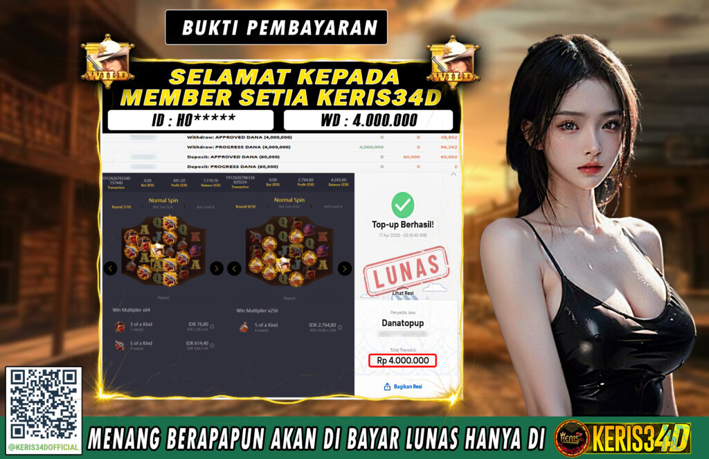 Setiap hari, member KERIS34D berhasil meraih jackpot besar dari berbagai provider slot ternama yang kami sediakan, seperti Pragmatic Play, Habanero, PG Soft, dan masih banyak lagi. Kami secara rutin menampilkan bukti screenshot atau rekapan kemenangan yang berhasil diraih, mulai dari kemenangan ratusan ribu hingga puluhan juta rupiah. Semua slip kemenangan ini kami hadirkan untuk membuktikan bahwa di KERIS34D, peluang menang itu nyata